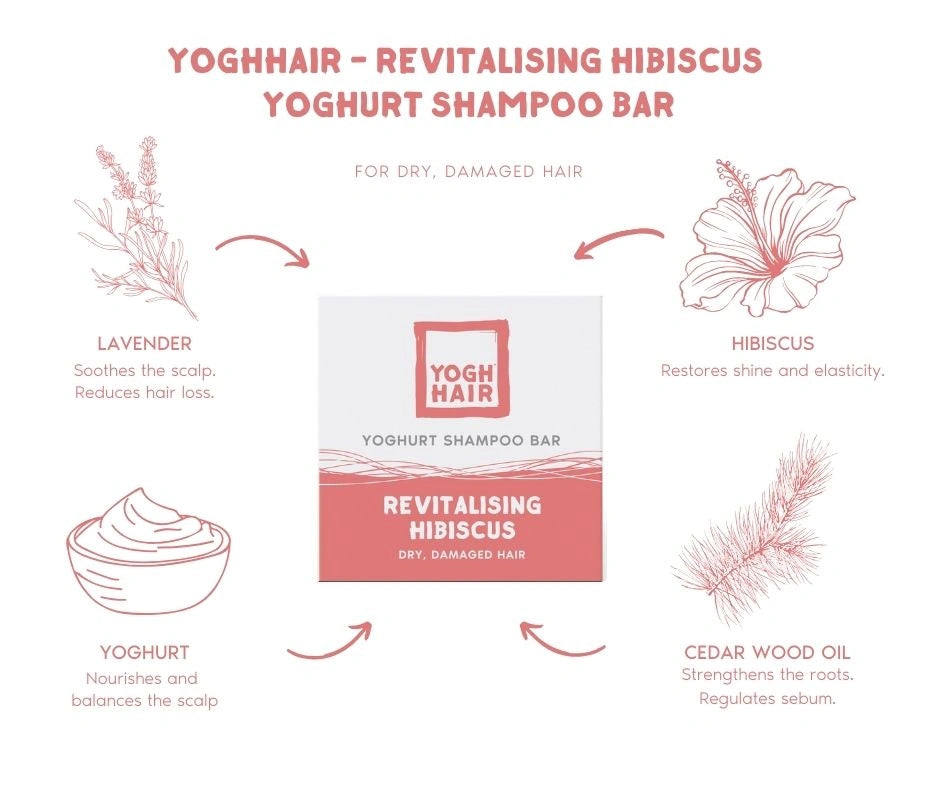 YOGHHAIR® Ревитализиращ Хибискус ефикасно почиства и регенерира косата, като щади деликатната среда на скалпа и обвивката на косъма. Комбинацията от кисело мляко и хибискус енергизира скалпа и косата и предотвратява цъфтежа ѝ. Цветът от хибискус укрепва корените и засилва блясъка, обема и еластичността на косъма. Маслата от лавандин и кедрово дърво подобряват кръвообръщението на скалпа, намаляват сухотата и пърхота. Измитата коса е възстановена, лъскава и жизнена.